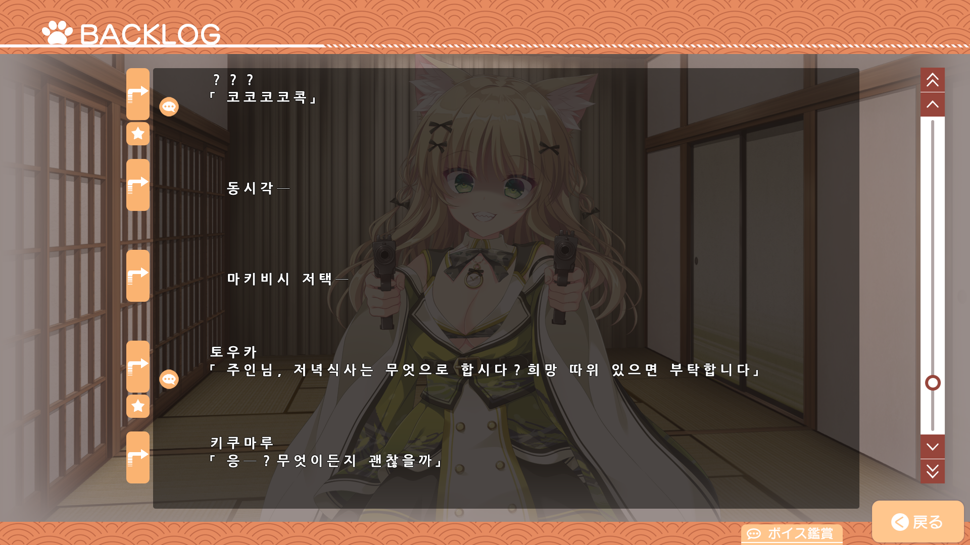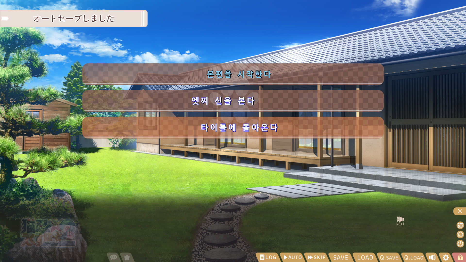 현재 대사와 백로그만 번역되고 다른건 일절 번역되지 않지만 자체 폰트 문제와 튕길 가능성 때문에 그대로 두고 있습니다.
